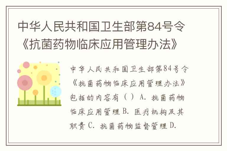 中华人民共和国卫生部第84号令《抗菌药物临床应用管理办法》包括的内容有() A. 抗菌药物临床应用管理 B. 医疗机构及其职责 C. 抗菌药物监督管理 D. 医疗机构的法律责任 E. 以上均包括