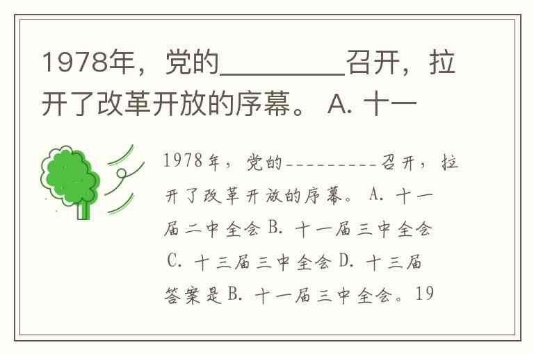 1978年,党的_________召开,拉开了改革开放的序幕。 A. 十一届二中全会 B. 十一届三中全会 C. 十三届三中全会 D. 十三届