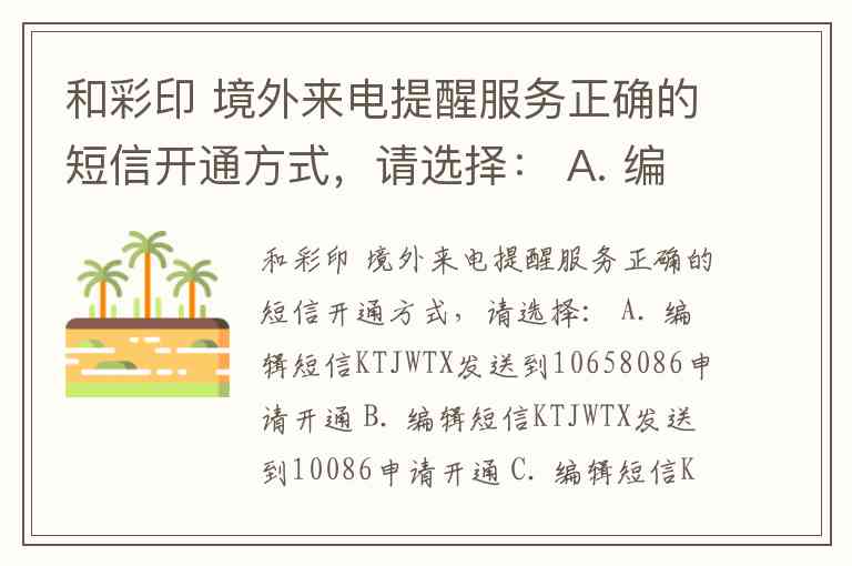 和彩印 境外来电提醒服务正确的短信开通方式,请选择: A. 编辑短信KTJWTX发送到10658086申请开通 B. 编辑短信KTJWTX发送到10086申请开通 C. 编辑短信KTJWTX发送到10088申请开通 D. 编辑短信KTJWTX发送到10658211申请开通