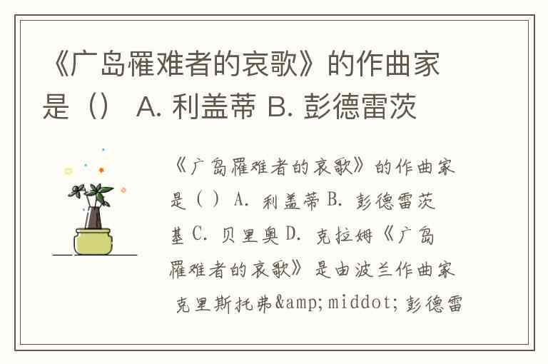 《广岛罹难者的哀歌》的作曲家是() A. 利盖蒂 B. 彭德雷茨基 C. 贝里奥 D. 克拉姆