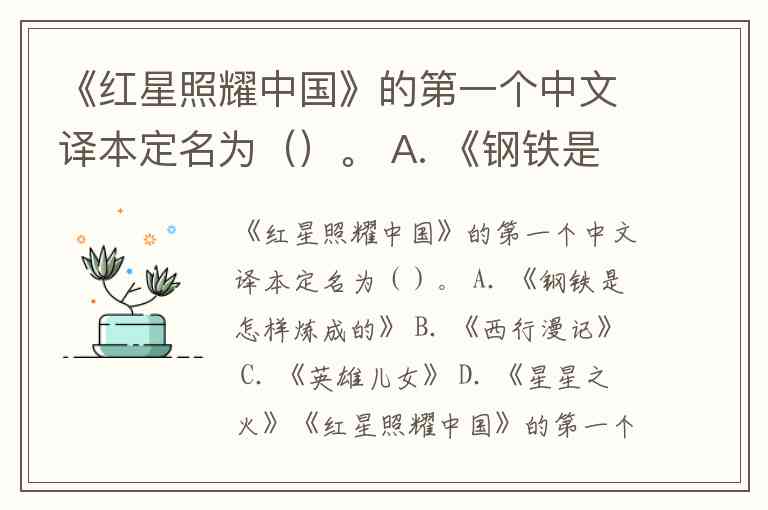 《红星照耀中国》的第一个中文译本定名为()。 A. 《钢铁是怎样炼成的》 B. 《西行漫记》 C. 《英雄儿女》 D. 《星星之火》