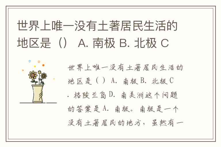 世界上唯一没有土著居民生活的地区是() A. 南极 B. 北极 C. 格陵兰岛 D. 南美洲