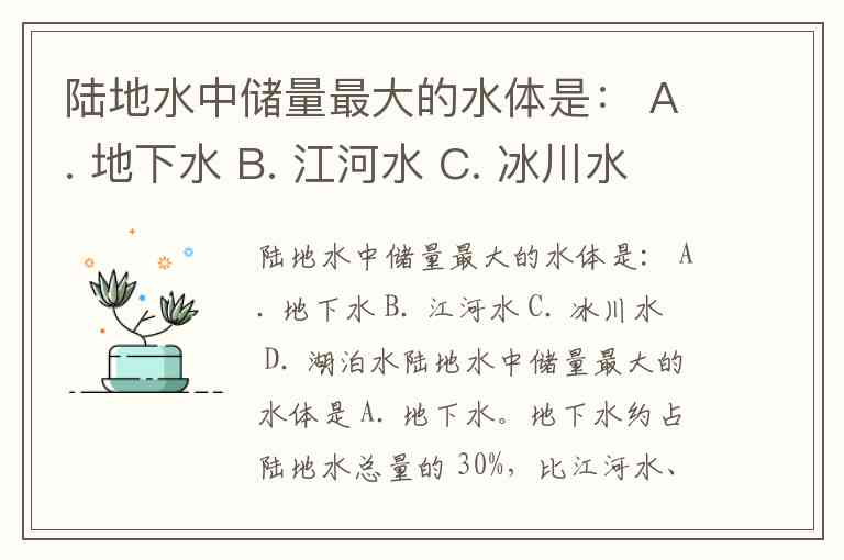 陆地水中储量最大的水体是: A. 地下水 B. 江河水 C. 冰川水 D. 湖泊水