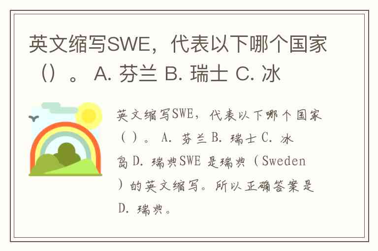 英文缩写SWE,代表以下哪个国家()。 A. 芬兰 B. 瑞士 C. 冰岛 D. 瑞典