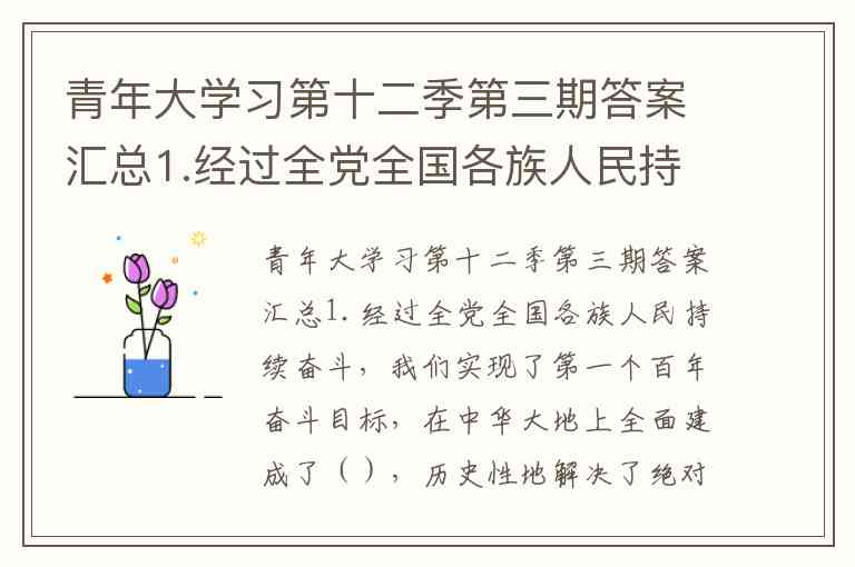 青年大学习第十二季第三期答案汇总1.经过全党全国各族人民持续奋斗,我们实现了第一个百年奋斗目标,在中华大地上全面建成了(),历史性地解决了绝对贫困问题,正在意气风发向着全面建成()的第二个百年奋斗目标迈进。 A. 小康社会 B. 市场经济 C. 现代化国家 D. 杜会主义现代化强国