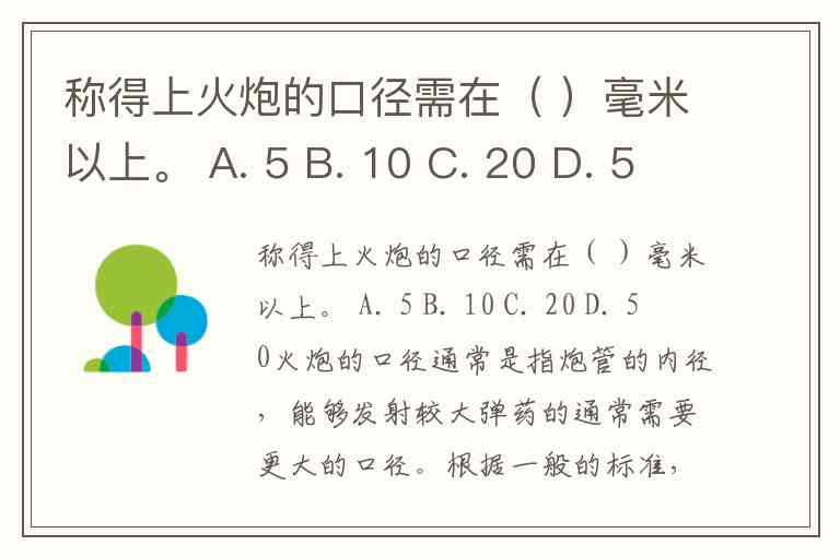称得上火炮的口径需在( )毫米以上。 A. 5 B. 10 C. 20 D. 50