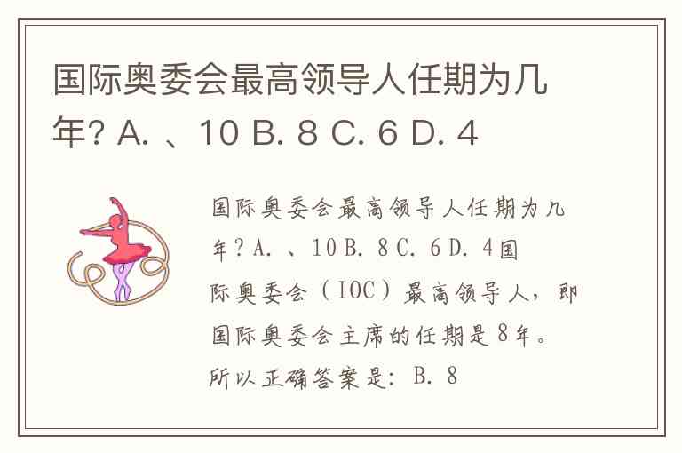 国际奥委会最高领导人任期为几年? A. 、10 B. 8 C. 6 D. 4