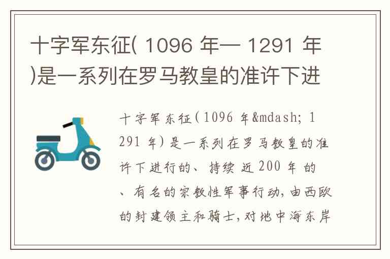 这些十字军东征始于1096年,持续了大约200年,旨在收复圣地耶路撒冷及其周边地区,主要是为了回应穆斯林的扩张。每次十字军东征都有不同的目标和影响,最初的目标是收复耶路撒冷,但随着时间的推移,十字军的方向和战略也发生了变化。