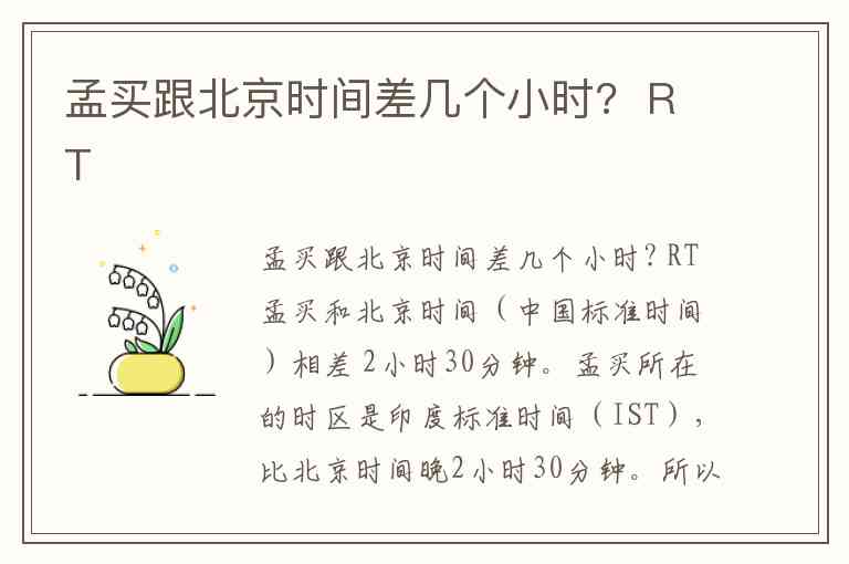 孟买和北京时间(中国标准时间)相差 2小时30分钟。孟买所在的时区是印度标准时间(IST),比北京时间晚2小时30分钟。