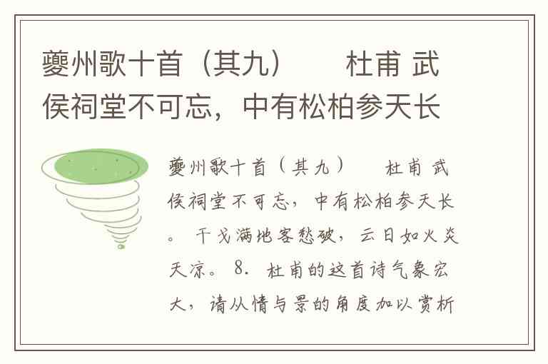 杜甫的《夔州歌十首(其九)》通过描写自然景象与历史遗迹,展现了诗人对过去战争和故国的深切思索,情与景交织,气象宏大。