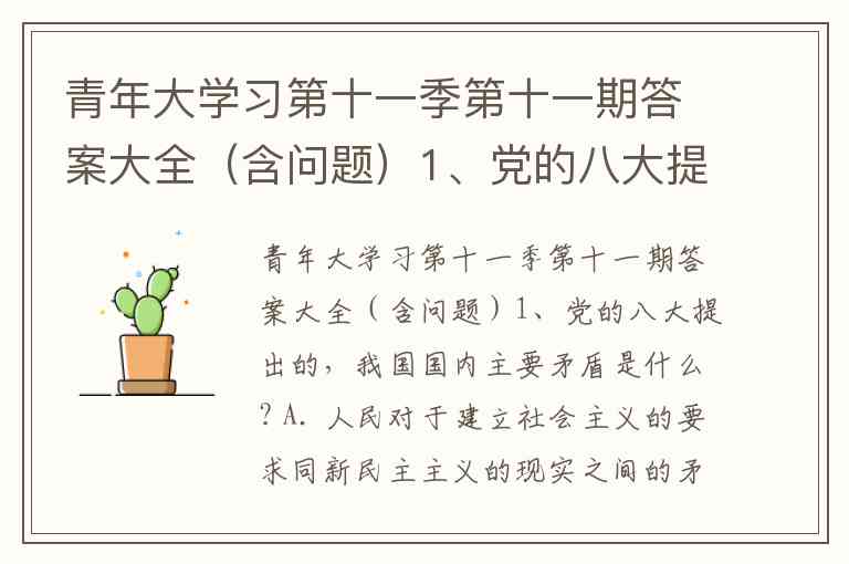 青年大学习第十一季第十一期答案大全(含问题)1、党的八大提出的,我国国内主要矛盾是什么? A. 人民对于建立社会主义的要求同新民主主义的现实之间的矛盾 B. 人民对于建立先进的工业国的要求同落后的农业国的现实之间的矛盾 C. 人民对于经济文化迅速发展的需求同当前经济文化不能满足人民需求的状况之间的矛盾 D. 人民日益增长的物质文化需要与落后的社会生产之间的矛盾