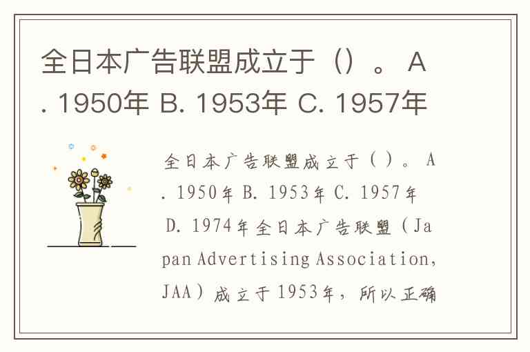 全日本广告联盟(Japan Advertising Association,JAA)成立于 1953年,所以正确答案是 B. 1953年。