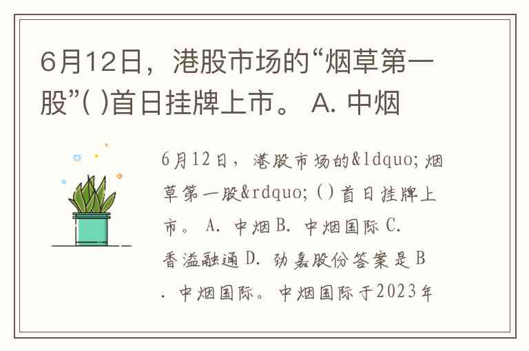 6月12日,港股市场的“烟草第一股”( )首日挂牌上市。 A. 中烟 B. 中烟国际 C. 香溢融通 D. 劲嘉股份