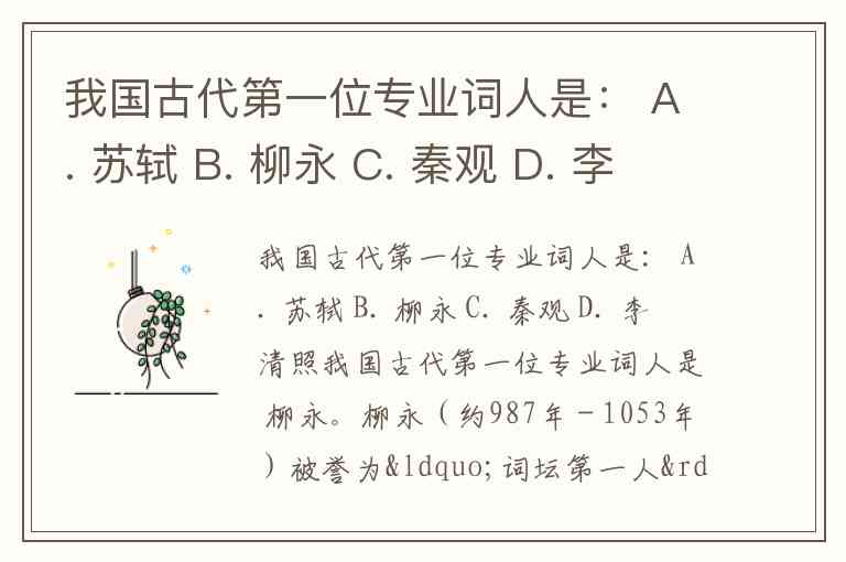 我国古代第一位专业词人是 柳永。