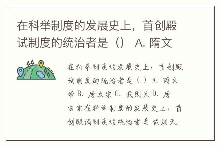 在科举制度的发展史上,首创殿试制度的统治者是() A. 隋文帝 B. 唐太宗 C. 武则天 D. 唐玄宗