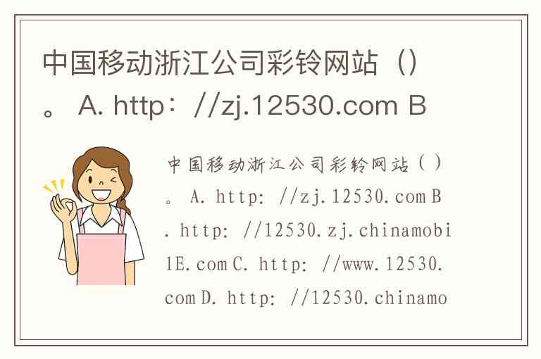 中国移动浙江公司彩铃网站()。 A. http://zj.12530.com B. http://12530.zj.chinamobilE.com C. http://www.12530.com D. http://12530.chinamobilE.cn