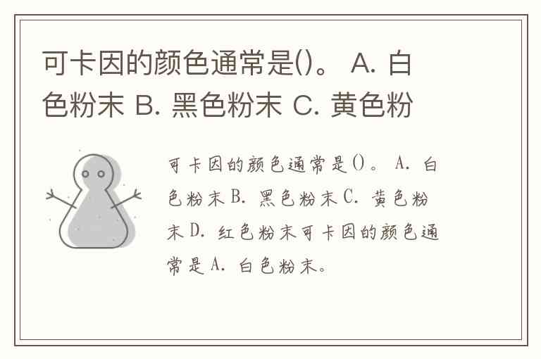 可卡因的颜色通常是()。 A. 白色粉末 B. 黑色粉末 C. 黄色粉末 D. 红色粉末