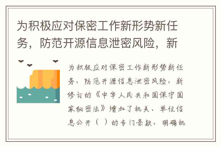 根据新修订的《中华人民共和国保守国家秘密法》,为了积极应对新形势下的保密工作,机关、单位需要依法对拟公开的信息进行保密审查。这意味着在公开信息之前,必须确保这些信息不涉及国家秘密,从而防范开源信息泄密的风险。