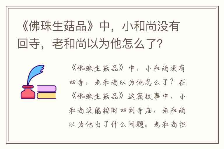 在《佛珠生菇品》这篇故事中,小和尚没能按时回到寺庙,老和尚以为他出了什么问题。老和尚担心的是,小和尚可能在外面遇到困境或者发生了什么不测,因为他一向是按时回寺的。这个情节表达了老和尚对小和尚的关心与牵挂,也反映了他们之间的师徒关系和对彼此的依赖。