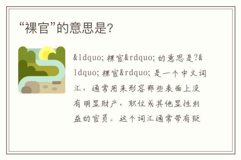 “裸官”是一个中文词汇,通常用来形容那些表面上没有明显财产、职位或其他显性利益的官员。这个词汇通常带有贬义,暗指这些官员通过关系、权力或者其他隐蔽手段,转移了他们的财富或资源,使得他们的个人资产无法直接被查到,因此“裸露”了他们的“官”身份,但实际上他们可能拥有不为人知的巨大财富。