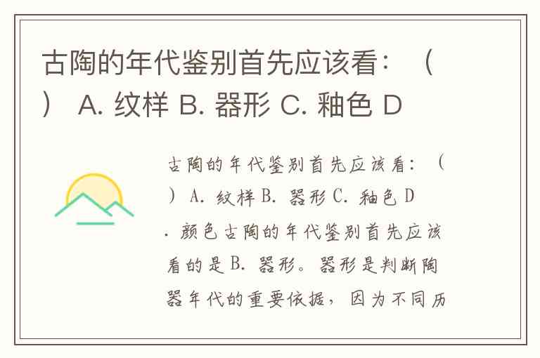 古陶的年代鉴别首先应该看:() A. 纹样 B. 器形 C. 釉色 D. 颜色