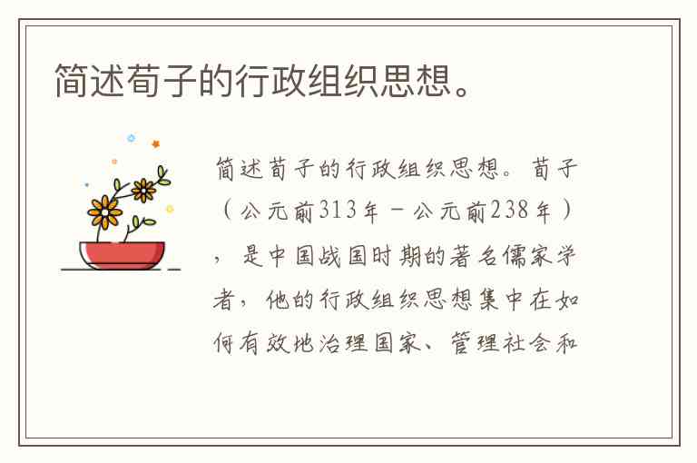 荀子(公元前313年-公元前238年),是中国战国时期的著名儒家学者,他的行政组织思想集中在如何有效地治理国家、管理社会和培养优秀人才等方面。具体来说,荀子的行政组织思想包括以下几个重要内容: