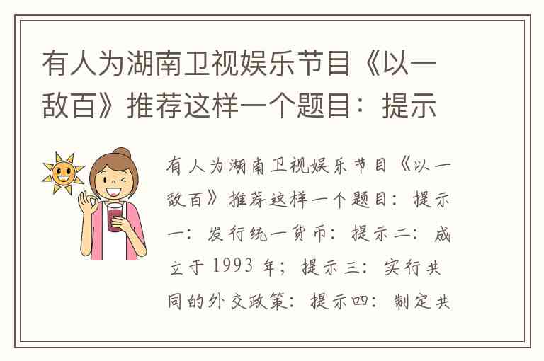 有人为湖南卫视娱乐节目《以一敌百》推荐这样一个题目:提示一:发行统一货币:提示二:成立于 l993 年;提示三:实行共同的外交政策:提示四:制定共同的防务计划。 这个组织是 A .三国同盟 B. 联合国 C .欧洲联盟 D. 世界贸易组织