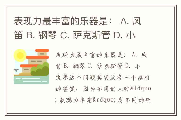 表现力最丰富的乐器是: A. 风笛 B. 钢琴 C. 萨克斯管 D. 小提琴