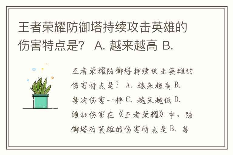 王者荣耀防御塔持续攻击英雄的伤害特点是? A. 越来越高 B. 每次伤害一样 C. 越来越低 D. 随机伤害