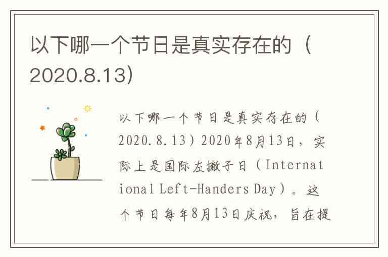 2020年8月13日,实际上是国际左撇子日(International Left-Handers Day)。这个节日每年8月13日庆祝,旨在提高人们对左撇子在日常生活中面临的挑战的认识,比如使用工具和设备时的不便。