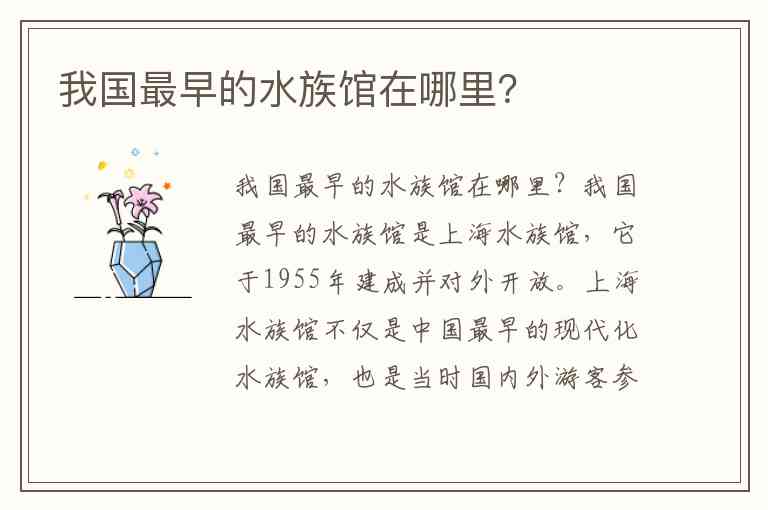我国最早的水族馆是上海水族馆,它于1955年建成并对外开放。上海水族馆不仅是中国最早的现代化水族馆,也是当时国内外游客参观的热点之一。它位于上海市浦东新区的世纪公园内,原本的水族馆经过几次改建和扩建,现在已经发展成了一个大型的水生动物展示和科研中心。