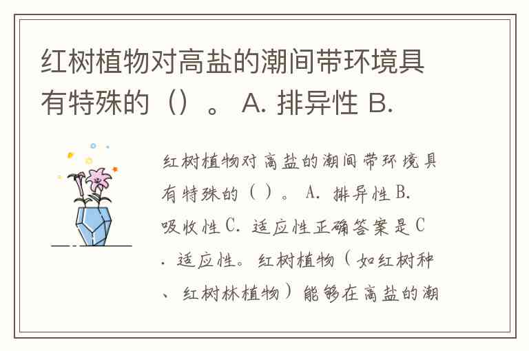 红树植物对高盐的潮间带环境具有特殊的()。 A. 排异性 B. 吸收性 C. 适应性