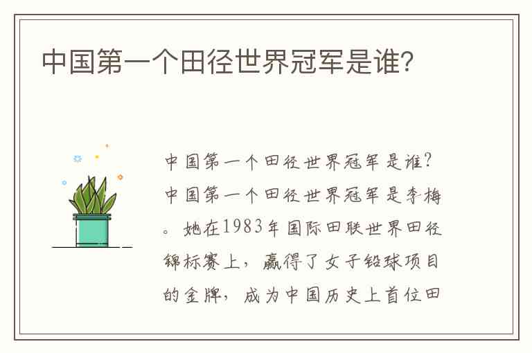 中国第一个田径世界冠军是李梅。她在1983年国际田联世界田径锦标赛上,赢得了女子铅球项目的金牌,成为中国历史上首位田径世界冠军。