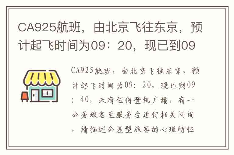 CA925航班,由北京飞往东京,预计起飞时间为09:20,现已到09:40,未有任何登机广播,有一公务旅客至服务台进行相关问询,请描述公差型旅客的心理特征,你作为一名服务人员应如何回答问询?