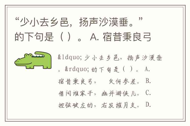 “少小去乡邑,扬声沙漠垂。”的下句是( )。 A. 宿昔秉良弓,楛矢何参差。 B. 借问谁家子,幽并游侠儿。 C. 控弦破左的,右发摧月支。 D. 名在壮士籍,不得中顾私。