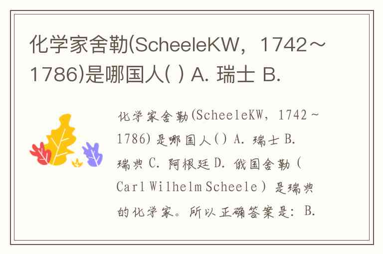 化学家舍勒(ScheeleKW,1742~1786)是哪国人( ) A. 瑞士 B. 瑞典 C. 阿根廷 D. 俄国