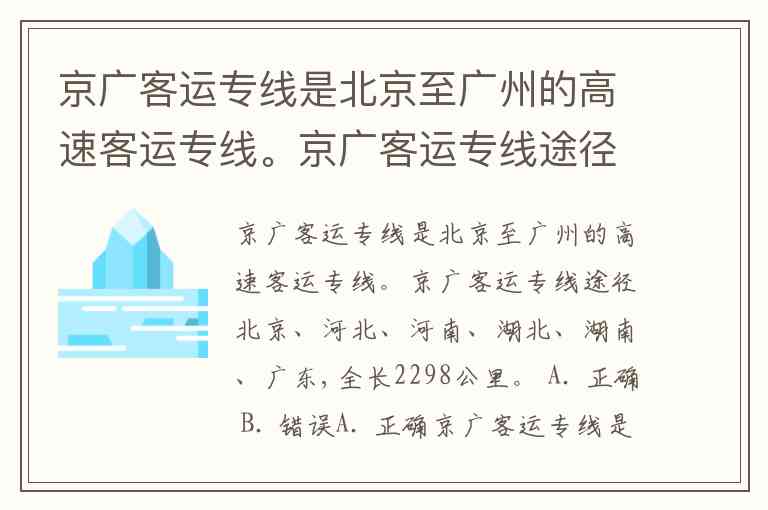 京广客运专线是北京至广州的高速客运专线。京广客运专线途径北京、河北、河南、湖北、湖南、广东,全长2298公里。 A. 正确 B. 错误