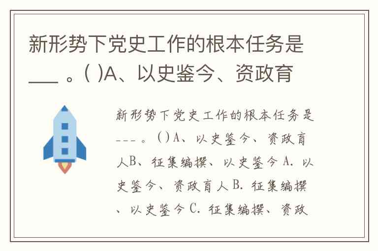 新形势下党史工作的根本任务是___ 。( )A、以史鉴今、资政育人B、征集编撰、以史鉴今 A. 以史鉴今、资政育人 B. 征集编撰、以史鉴今 C. 征集编撰、资政育人 D. 学习研究、宣传教育