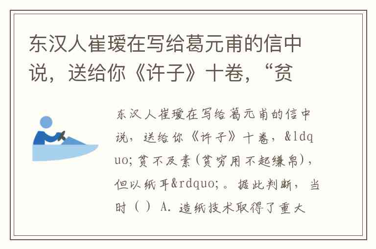 东汉人崔瑷在写给葛元甫的信中说,送给你《许子》十卷,“贫不及素(贫穷用不起缣帛),但以纸耳”。据此判断,当时() A. 造纸技术取得了重大突破 B. 雕版印刷术已经开始推广 C. 纸张成为人们生活必需品 D. 纸作为书写材料较为常见