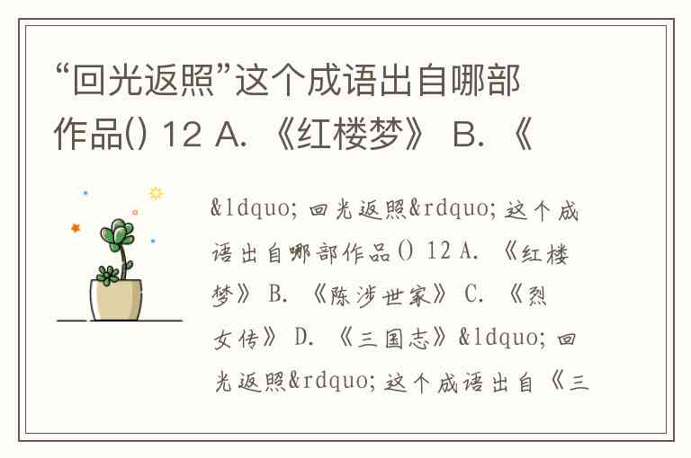 “回光返照”这个成语出自哪部作品() 12 A. 《红楼梦》 B. 《陈涉世家》 C. 《烈女传》 D. 《三国志》