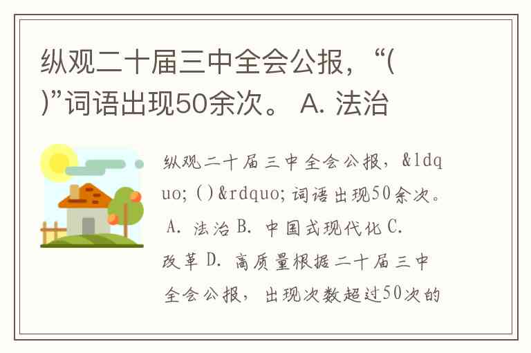 纵观二十届三中全会公报,“( )”词语出现50余次。 A. 法治 B. 中国式现代化 C. 改革 D. 高质量
