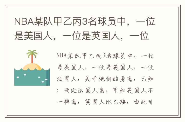 NBA某队甲乙丙3名球员中,一位是美国人,一位是英国人,一位法国人,关于他们的身高,已知:丙比法国人高,甲和英国人不一样高,英国人比乙矮,由此可以推知( ) A. 甲不是法国人 B. 英国人比甲矮 C. 法国人比美国人高 D. 法国人最矮