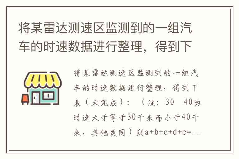 将某雷达测速区监测到的一组汽车的时速数据进行整理,得到下表(未完成): (注:30〜40为时速大于等于30千米而小于40千米,其他类同)则a+b+c+d+e=__.