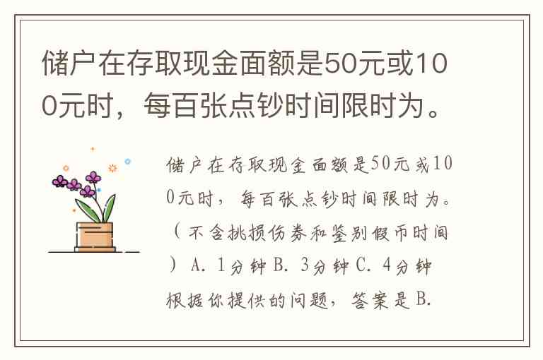 储户在存取现金面额是50元或100元时,每百张点钞时间限时为。(不含挑损伤券和鉴别假币时间) A. 1分钟 B. 3分钟 C. 4分钟