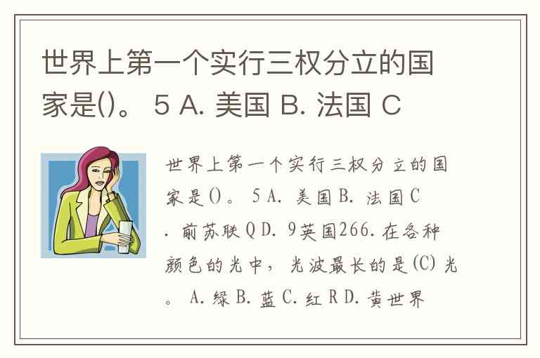世界上第一个实行三权分立的国家是()。 5 A. 美国 B. 法国 C. 前苏联 Q D. 9英国266.在各种颜色的光中,光波最长的是(C)光。 A.绿 B.蓝 C.红 R D.黄