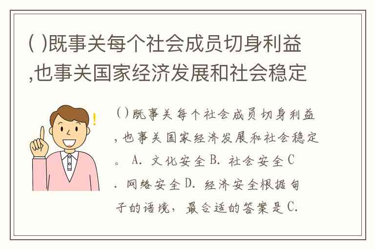 ( )既事关每个社会成员切身利益,也事关国家经济发展和社会稳定。 A. 文化安全 B. 社会安全 C. 网络安全 D. 经济安全