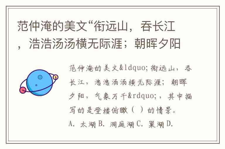 范仲淹的美文“衔远山,吞长江,浩浩汤汤横无际涯;朝晖夕阳,气象万千”,其中描写的是登楼俯瞰( )的情景。 A. 太湖 B. 洞庭湖 C. 巢湖 D. 洪泽湖