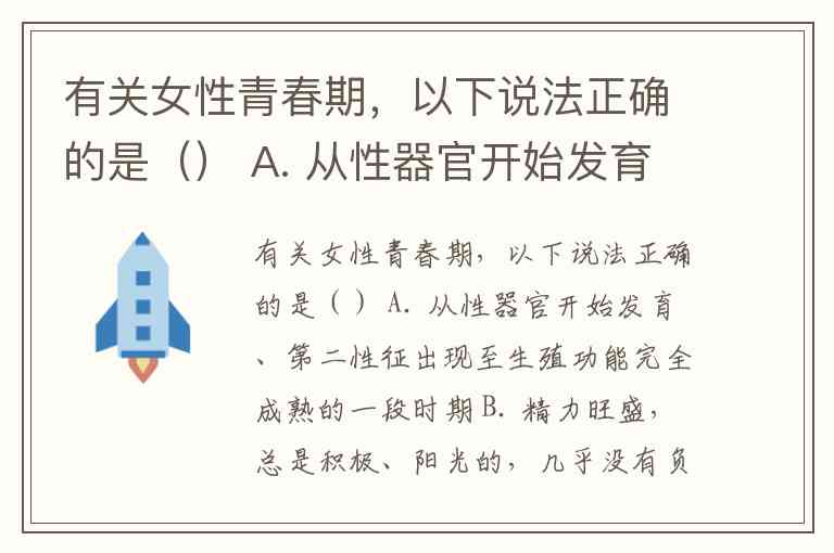 A:这段描述的时间范围是女性的青春期,但问题的关键在于“第二性征出现至生殖功能完全成熟”这一部分,青春期并不仅仅是性器官发育,而是包括整个生理、心理的变化,因此这个描述不是特别准确。