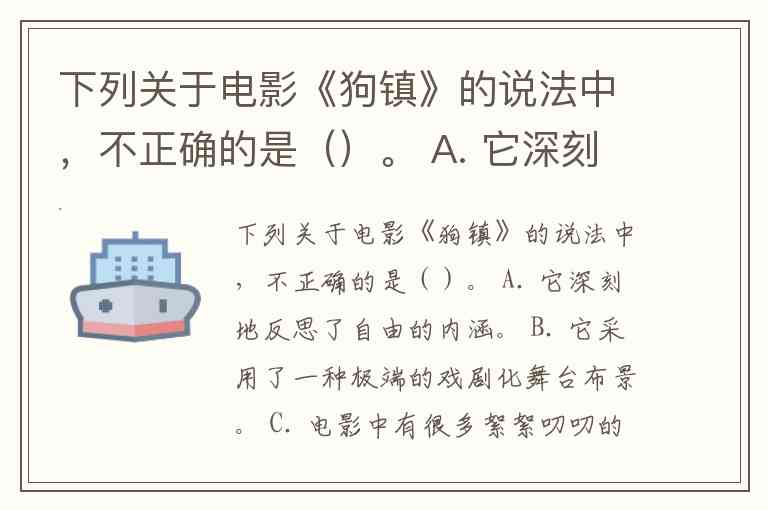 下列关于电影《狗镇》的说法中,不正确的是()。 A. 它深刻地反思了自由的内涵。 B. 它采用了一种极端的戏剧化舞台布景。 C. 电影中有很多絮絮叨叨的对话。 D. 从它不是很商业化的电影,具有实验性。