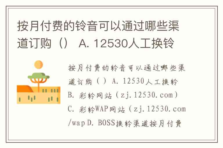 按月付费的铃音可以通过哪些渠道订购() A. 12530人工换铃 B. 彩铃网站(zj.12530.com) C. 彩铃WAP网站(zj.12530.com/wap D. BOSS换铃渠道